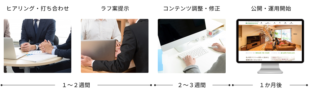 各コンテンツを含め、ホームページのベースが出来上がった時点で公開します。 公開後も弊社にて、更新・修正の際の技術的なサポートをさせていただきます。 |